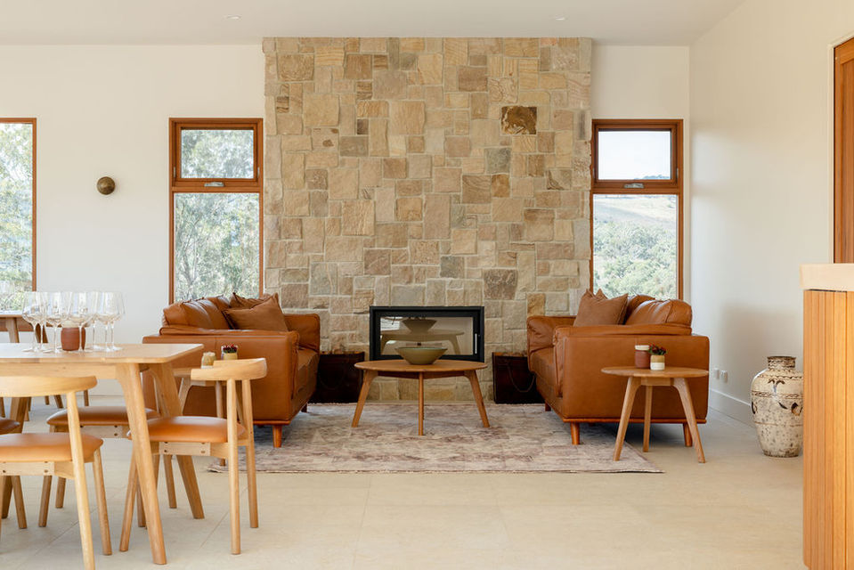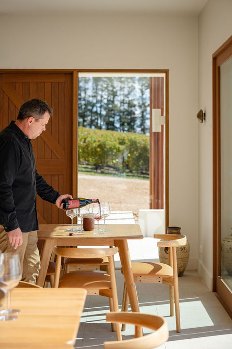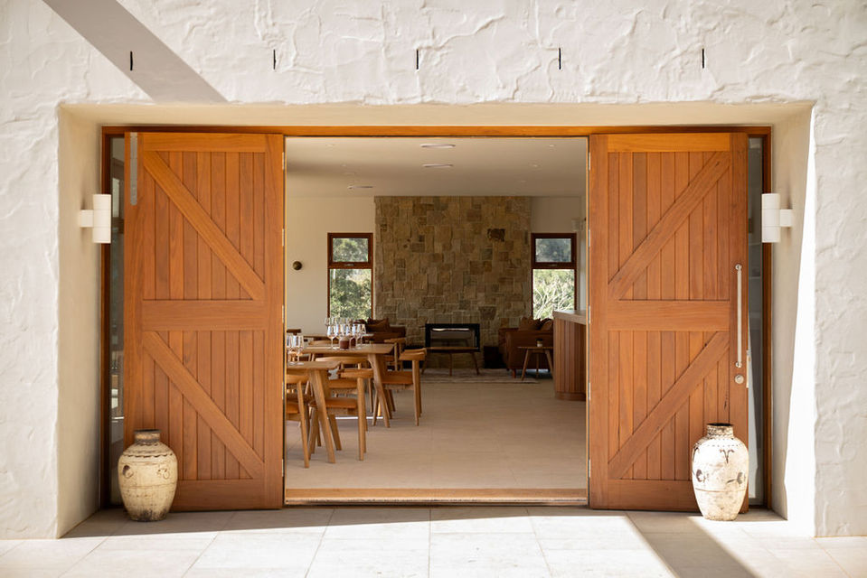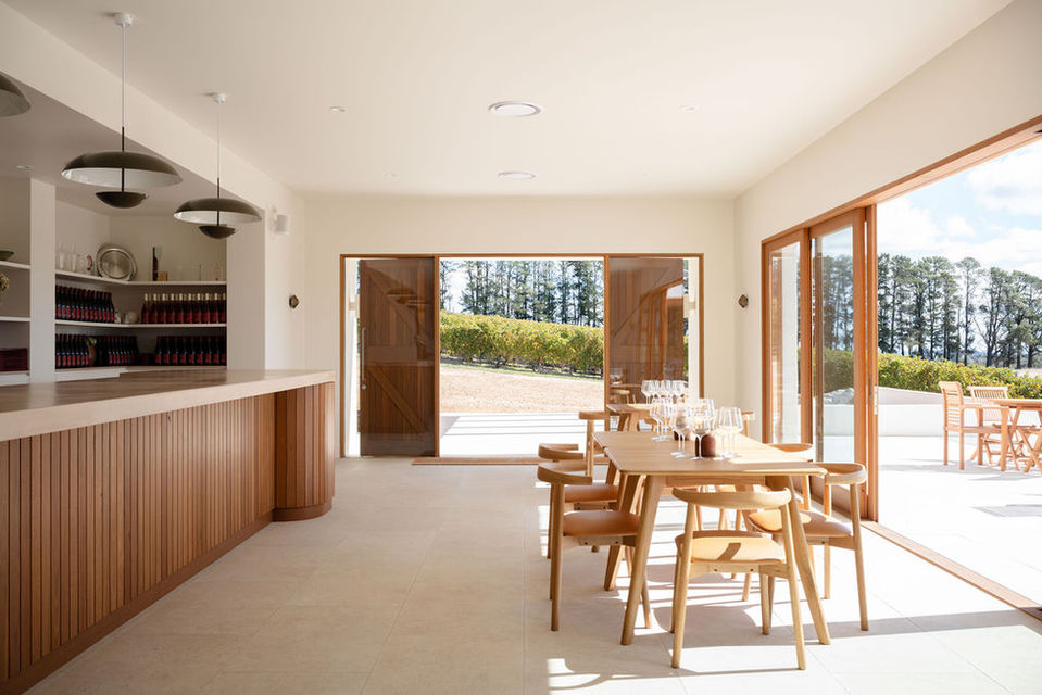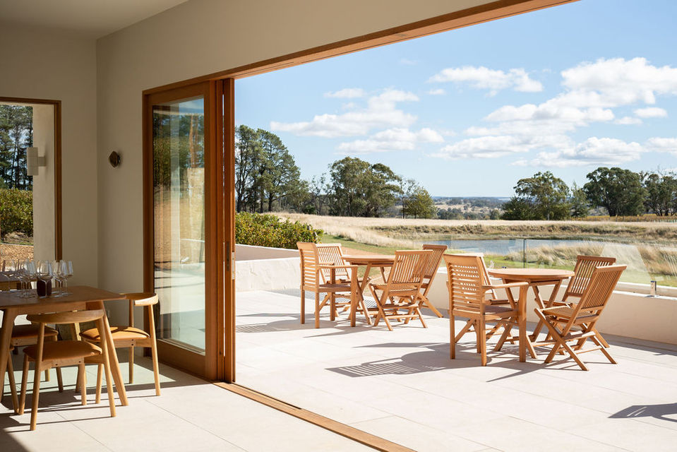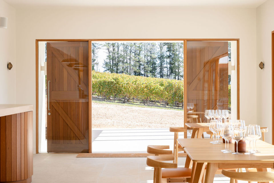 Triple stacking sliding doors opening 7.2m wide, connecting the cellar door to the vines beyond.​​